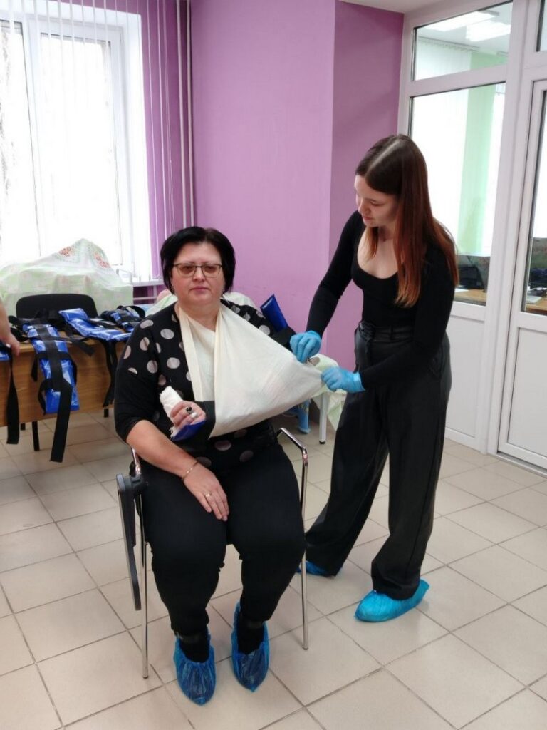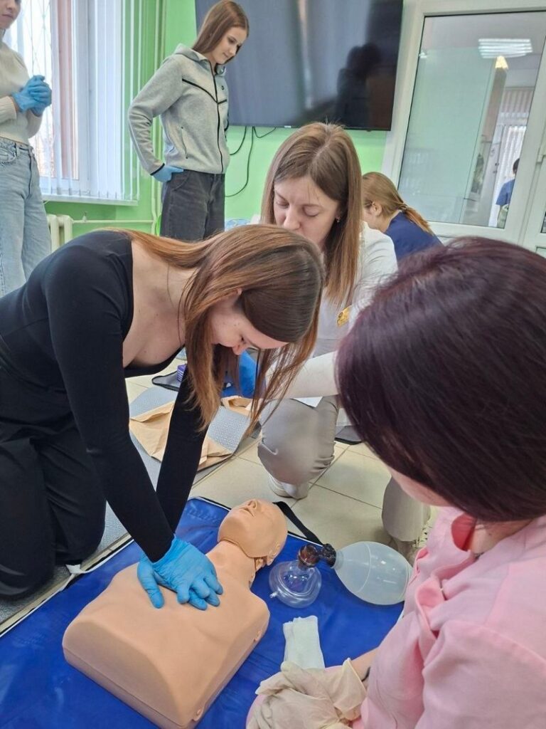 Далее их ждала практика. Школьники пробовали свои силы в выполнении сердечно-легочной реанимации на специальных манекенах, останавливали кровотечение, выполняли иммобилизацию и др. Также они оказывали помощь пострадавшему в сознании и без, при инсульте, боли в груди, обмороке.