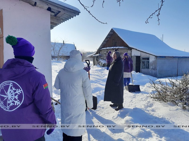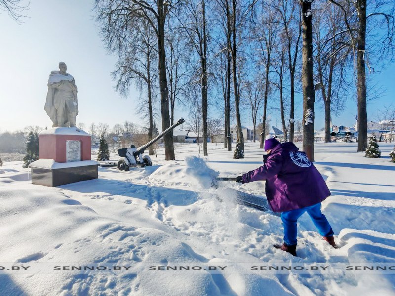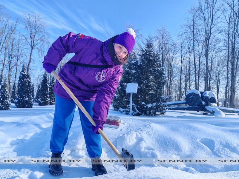 Разделившись на две группы, участники республиканского трудового проекта «Зимний маршрут» очистили от снега прилегающие территории памятников погибших солдат в парке Трех Героев, а также приусадебный участок одиноко проживающей сенненки, инвалида по зрению Лилии Викторовны Шевяковой.