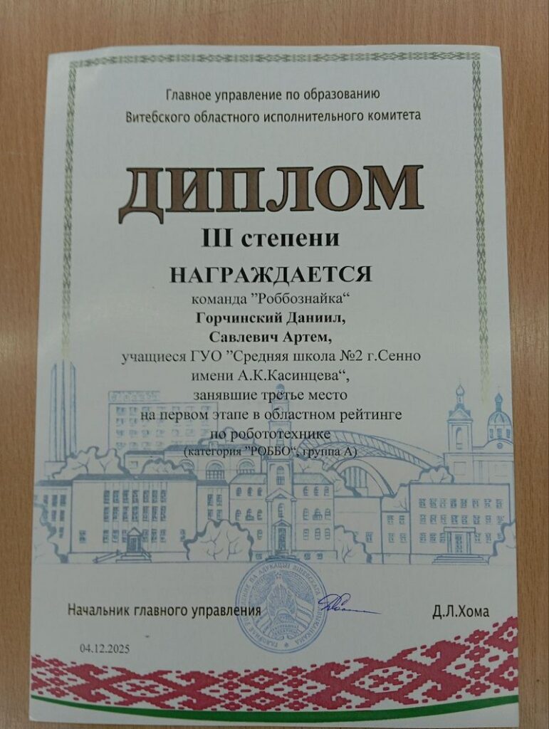 Команда «Роббознайка» в составе учащихся 7 класса ГУО «Средняя школа №2 г.Сенно имени А.К.Касинцева» Даниила Горчинского и Артёма Савлевича, удостоена диплома третьей степени. Юные новаторы продемонстрировали свои силы в соревновательной категории «РОББО», группе А.