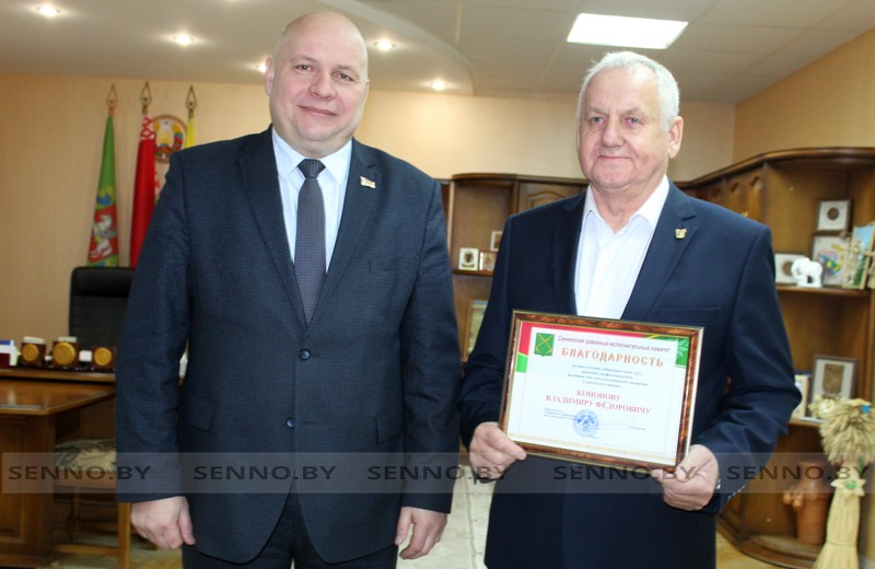 Благодарность председателя Сенненского районного исполнительного комитета объявлена Владимиру Фёдоровичу КОНОНОВУ, ветерану труда, за многолетний добросовестный труд, высокий профессионализм и активное участие в ветеранском движении Сенненского района.