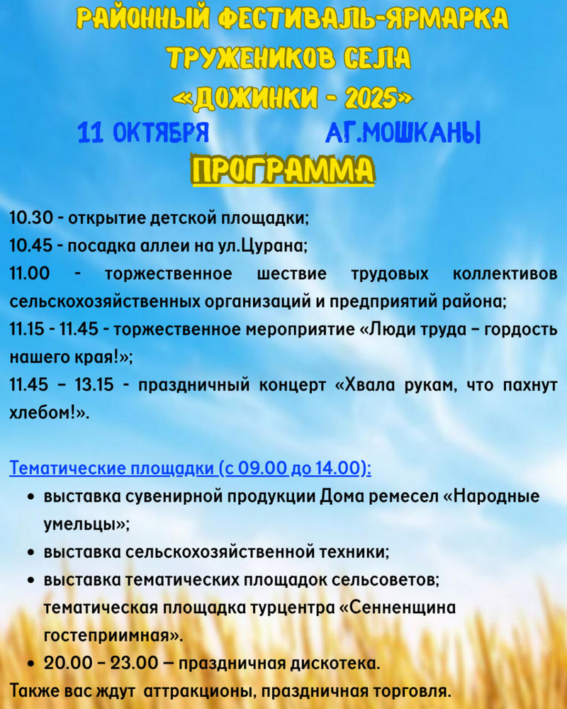 Афіша Сельская гаспадарка Сельское хозяйство ОБНОВЛЕННАЯ программа районного фестиваля-ярмарки тружеников села «Дожинки – 2025» в аг.Мошканы 11 октября Четверг, 9 окт., 2025 72 admin ПРОГРАММА районного фестиваля-ярмарки тружеников села «Дожинки – 2025». Мероприятие пройдет в аг.Мошканы 11 октября.