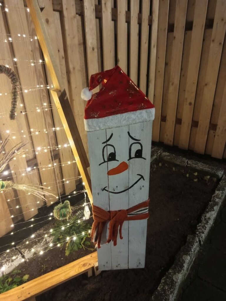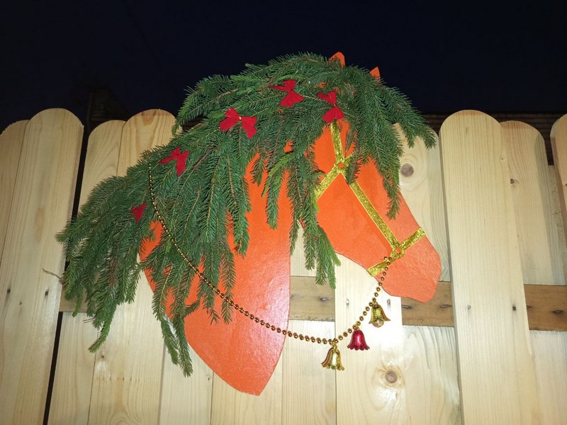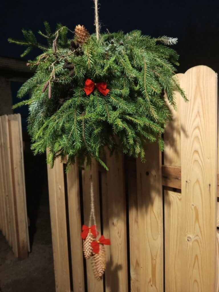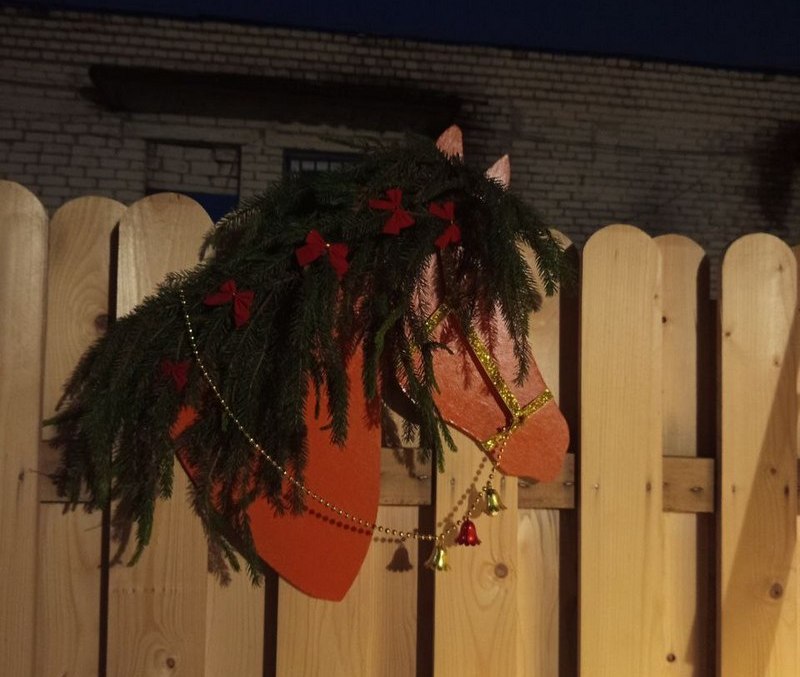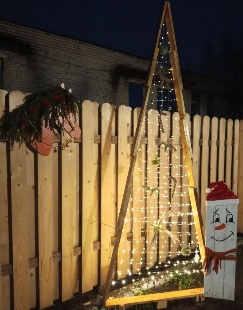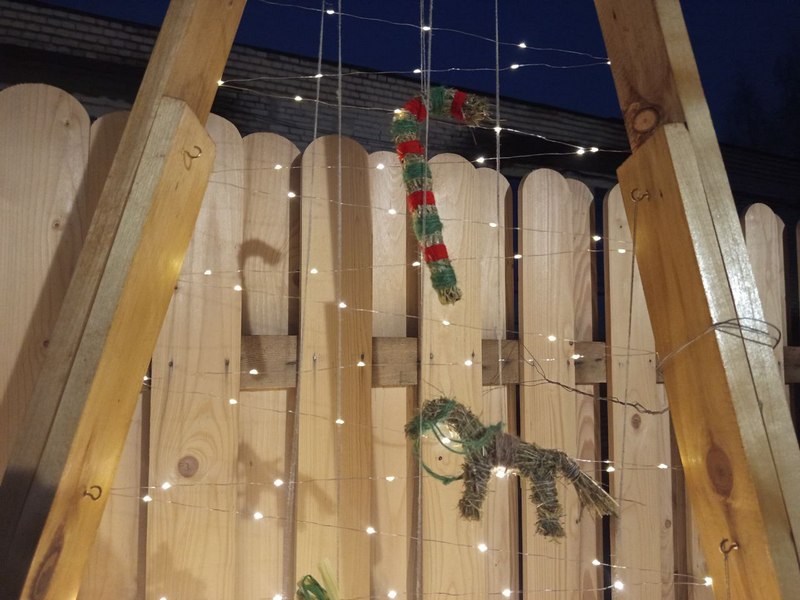 Украшают ее веночки из ели, а также малые архитектурные формы – затейливые снеговики. Изюминкой выступает современная эко-елка. Ее каркас сделан из дерева. Вместо елочных веточек – гирлянда, на которой развешаны игрушки. А они собраны вручную из сена и связаны льняной нитью.
