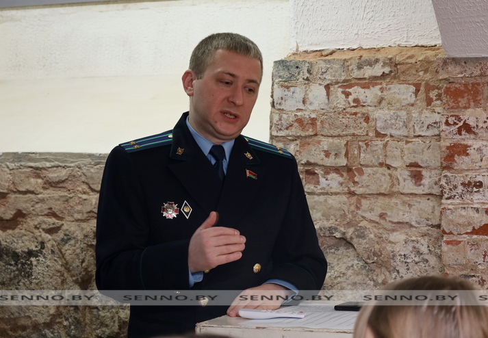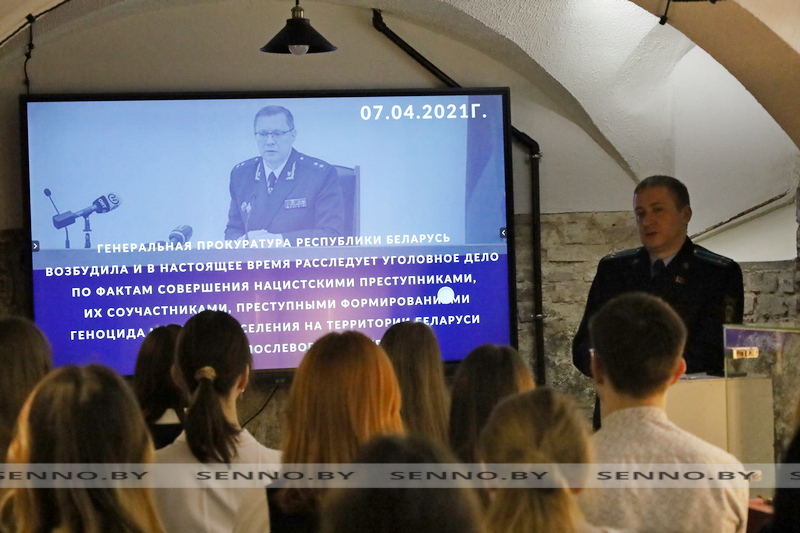 С тематическим докладом перед присутствующими выступил Евгений Домкин, заместитель прокурора Сенненского района. Представитель закона подробно рассказал молодежи о расследуемом Генеральной прокуратурой Республики Беларусь уголовном деле по фактам совершения нацистскими преступниками, их соучастниками, преступными формированиями геноцида мирного населения на территории Беларуси в годы Великой Отечественной войны и послевоенный период. Это и стало ключевой темой встречи.
